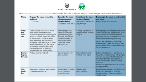 These resources are designed to help individuals, small groups, leadership teams and churches move forward in racial reconciliation. For the full collection of resources, tap below to visit Beacon Church's page, but a few examples are below.